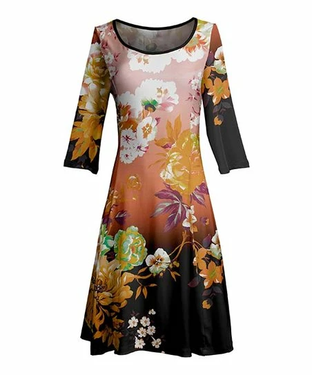 An A-line profile and stretchy knit fabric make this artsy scoop neck dress figure-flattering, and the three-quarter sleeves keep you cozy throughout your weekend outings.