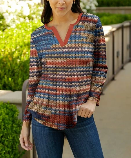 Stay comfy throughout the day with this stretch-infused top featuring an on-trend notched neckline and long sleeves.