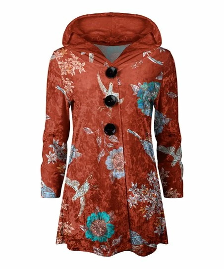 Flowy velvet hoodie featuring a button-front style and roomy hood.