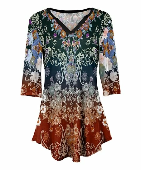 Add to your wardrobe with this colorful three-quarter sleeve tunic that features a flattering v-neckline and a comfortable relaxed fit.