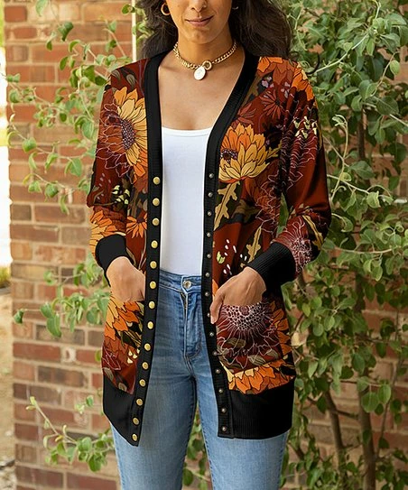 This cardigan features a floral motif and pockets on either side. Stretch-enhanced for flexible comfort.
