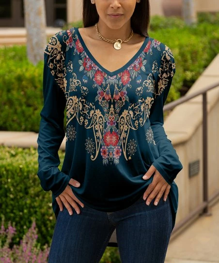 Splash a dash of personality onto your everyday ensembles with this v-neck tunic sporting an elegant floral print and long sleeves that offer warm coverage.