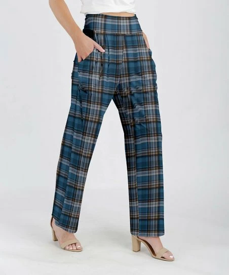 Patterned pants featuring a draping fit with a wide waistband and roomy pockets.