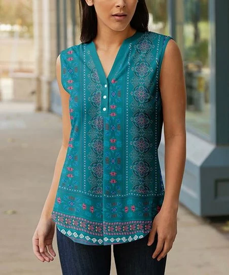 A sleeveless cut is paired with a bold print for a sunny-day option that’s packed with personality.