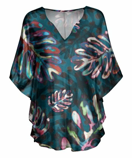 This lightweight tunic features a v-neck, bold print and roomy dolman sleeves.