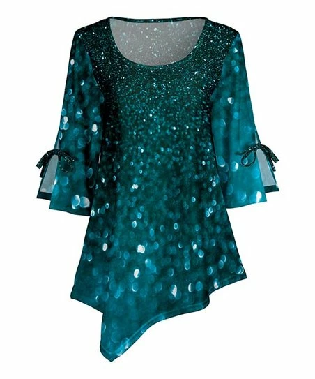 Step up your style with this asymmetrical tunic featuring tie-accented bell sleeves and stretch-enhanced material.