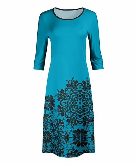 Infuse vibrant, fashionable style into your looks with this midi dress featuring a bit of stretch for enhanced comfort. Three-quarter sleeves and a bold print add flair.