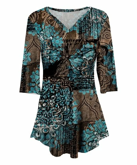 The flaring hem of this contemporary tunic accents your natural curves and visually slims your waist. Three-quarter length sleeves give you just-right coverage.