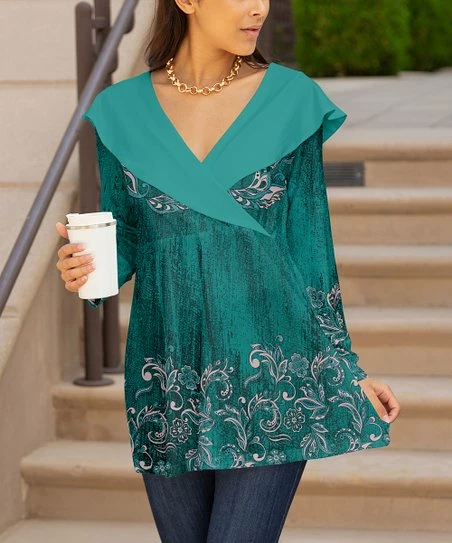 Look graceful in this flowy tunic featuring a flattering surplice bodice and a bold oversize collar.