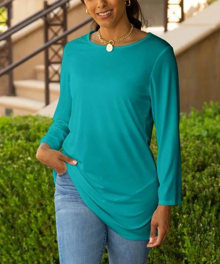 Expand your mix-and-match options with this versatile tunic boasting long sleeves for breezy-day comfort.