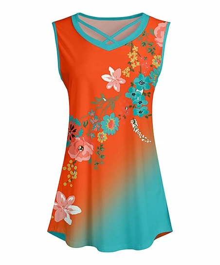Beat the heat in standout style wearing this boldly patterned tunic that features a sleeveless design and get-noticed print. Crisscross straps liven up the v-neck, and a flared cut makes it figure-flattering.