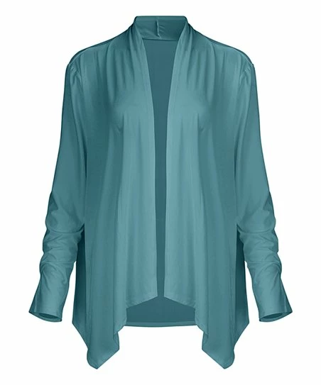 Top off your ensembles with this stretchy knit cardigan featuring a shawl-like collar that flows into a drape-front design for comfortably stylish layered looks.