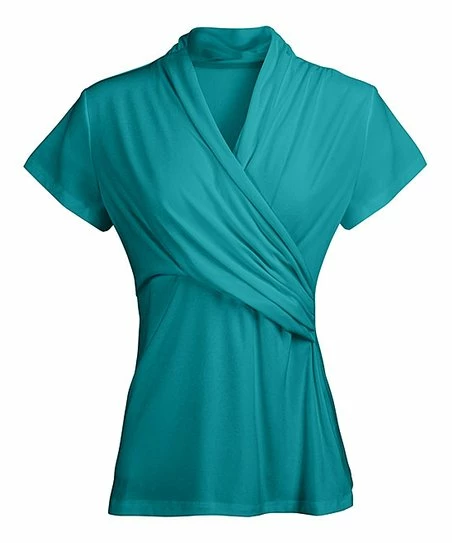 A surplice neckline highlights your features and emphasizes your waist in this short-sleeved tunic made with a versatile color.