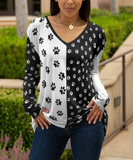 This long-sleeve tunic has a V-neck cut and color block paw print patterns for casual wardrobe collections.