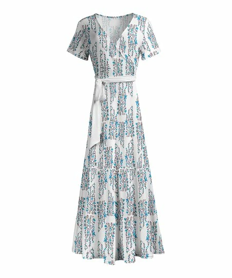 Refresh your closet with this surplice maxi dress featuring a belted design and made with a stretch-enhanced fabric.