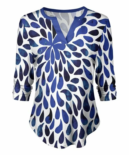 Three-quarter sleeves and a notch neckline bring casual flair to this bold patterned top.