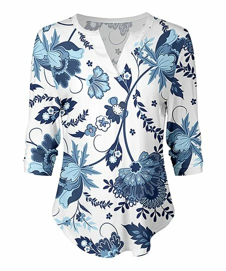 You’ll look sharp in this top that features a notch neckline and a blooming print.