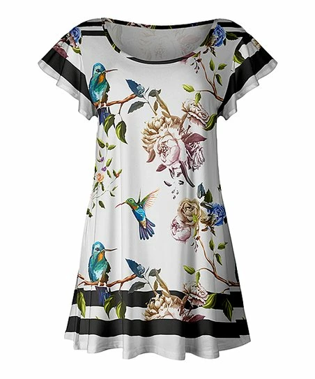 Rustle up whimsical style by donning this ruffled tunic that comes equipped with a vacation-ready print and breathable stretch-infused fabric for all-day comfort.