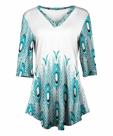 Refresh your wear-everywhere wardrobe rotation with this v-neck tunic featuring stretchy knit fabric and a unique pattern layout. Three-quarter length sleeves offer season-spanning style for maximum pairing potential.