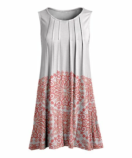 Crisp pleats add polished dimension to this sleeveless tunic that boasts an intricate medallion print and necklace-ready jewel neck.