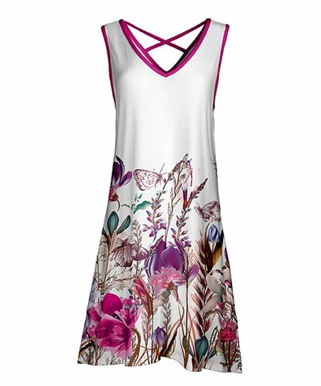 Embrace sunny weather in this A-line dress that has a v neckline in front and back, with the back v enhanced by crisscrossing straps.