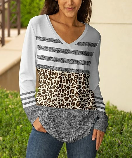 Lily | White & Gray Leopard & Stripe V-Neck Long-Sleeve Tunic – Women & Plus