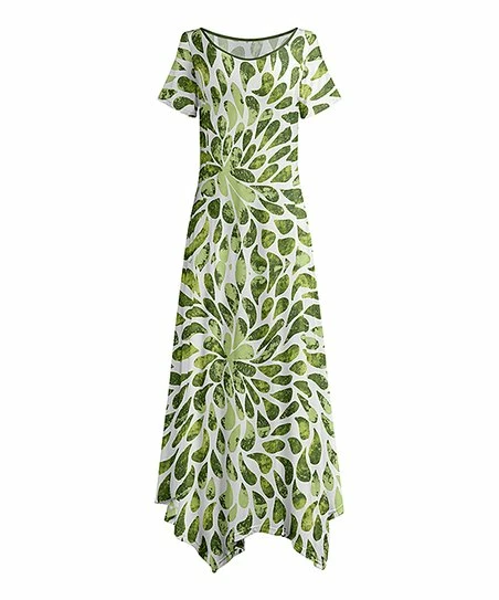 This bold maxi dress features a handkerchief hem with a scooped neckline and a hint of comfortable stretch.