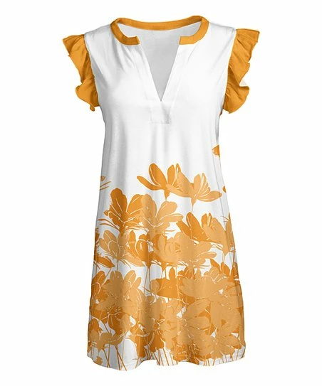 Revive your warm-weather wardrobe with this lively tunic featuring ruffly sleeves and classic notch neckline.