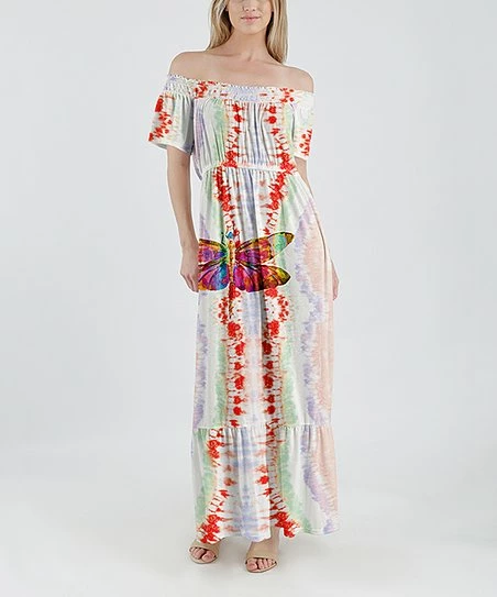 Elevate warm-weather days with the off-shoulder silhouette of this billowy maxi dress finished in a bright tie-dye design for whimsical flair.