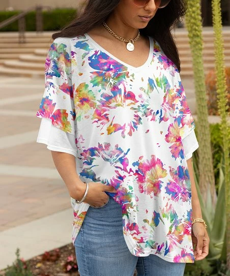 Lily | White & Pink Abstract Layered-Sleeve V-Neck Tunic – Women & Plus