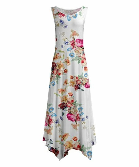 Add flowy comfort to your sunny day rotation with this lively maxi dress crafted with a handkerchief hem and stretch-enhanced fabric.