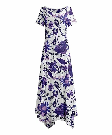 Flowing to a handkerchief hem, this maxi dress has a flowy mod profile. Short sleeves and scoop neck.