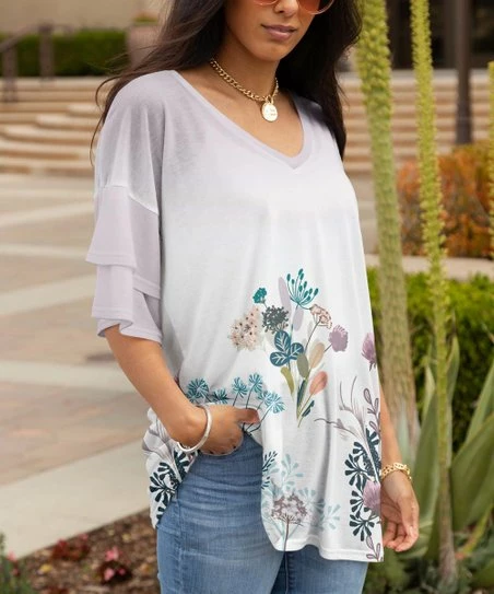 Playful ruffle sleeves and a bold print add visual appeal to this v-neck tunic crafted with a hint of stretch for all-day comfort.