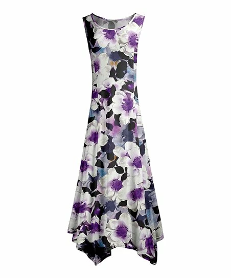 This stretch-enhanced sleeveless dress boasts a lush floral print and a flowing handkerchief hem for a sunny style with springtime flair.