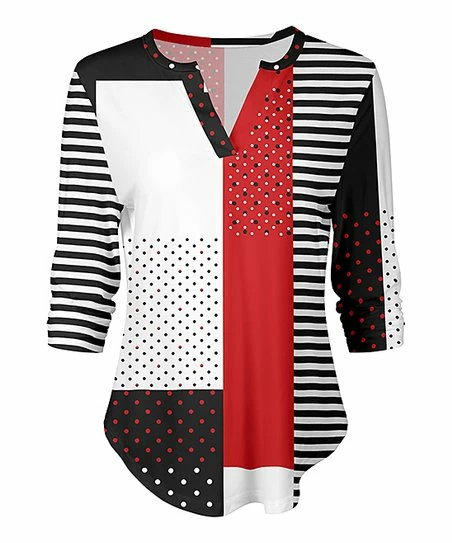 Elevate your casual style with this three-quarter sleeve top that features an eye-catching print and a flattering notch neckline.