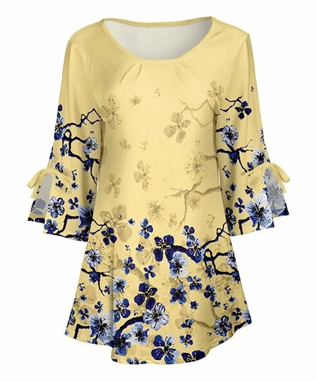 Lily | Yellow & Blue Cherry Blossom Bow-Accent Three-Quarter Sleeve Tunic – Women & Plus