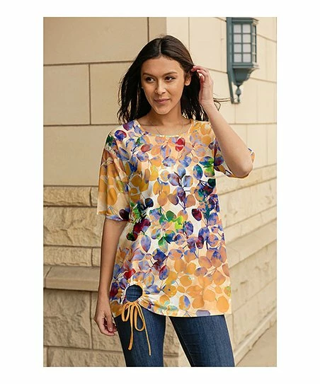 Enliven your wardrobe with the nature-inspired print on this relaxed tunic featuring a drawstring-enclosed cutout along the hem.
